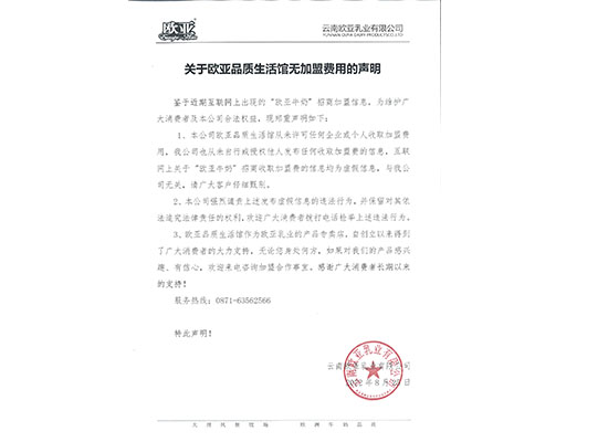 關于歐亞品質生活館無加盟費用的聲明